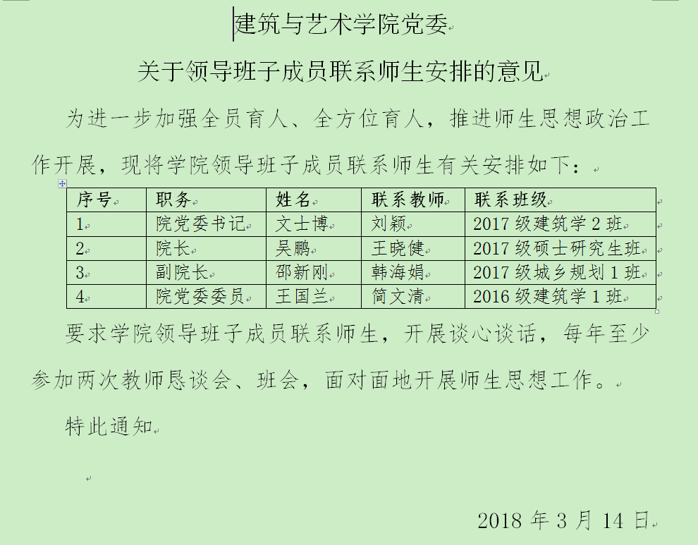关于领导班子成员联系师生安排的意见