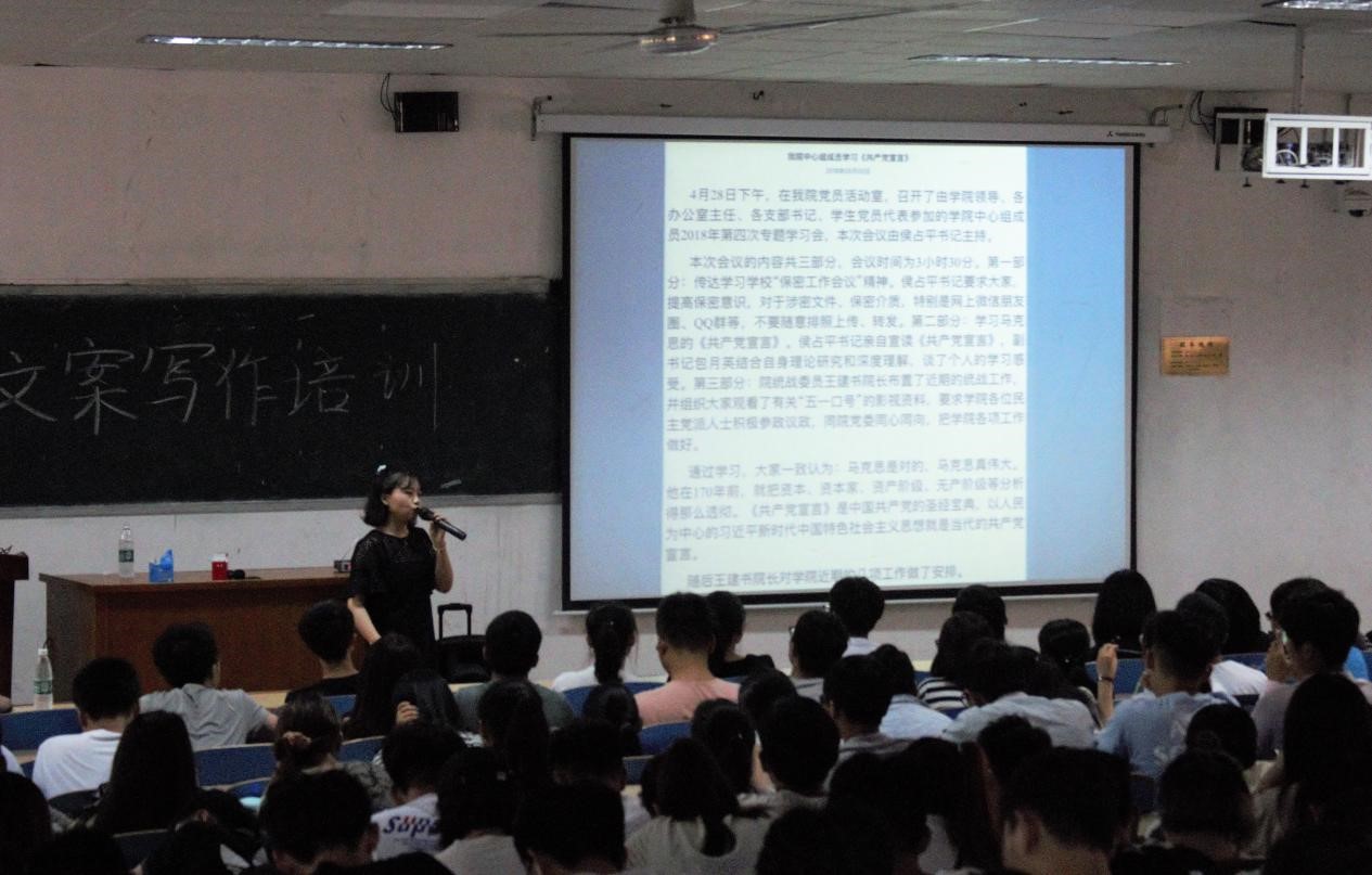 5月15日,我院在五教103召开文案写作培训会,河北工程大学党委宣传部网络新闻科李晴晴老师担任主讲,我院党委书记文士博,学工办主任、团委书记王世阳以及我院300名学生参加了本次培训会。