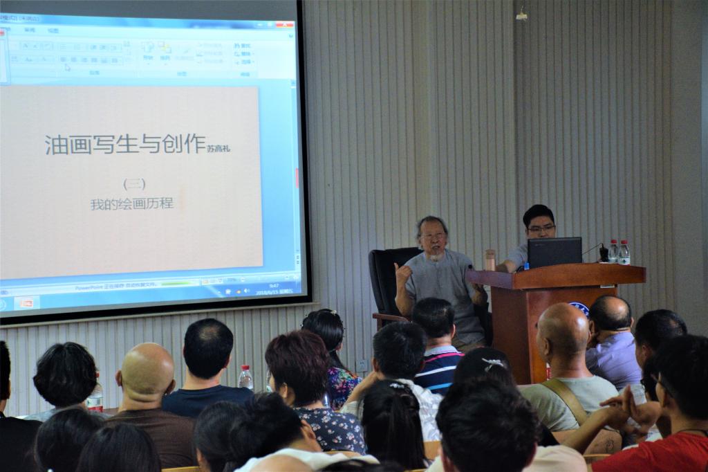 苏高礼教授通过他各个时期的作品来讲述他的写生之路,其中有素描、水粉、水彩、油画等绘画作品,作品描绘了各地的风土人情,展示了画家的高超绘画技能和水平。最后,苏高礼教授与同学们针对绘画写生方面进行了交流与探讨。