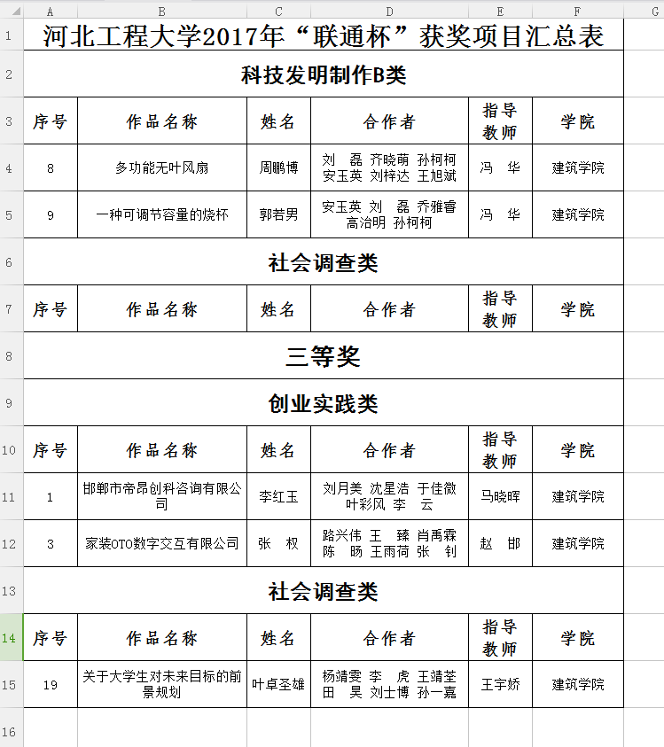 2017年12月20日,由校团委组织的河北工程大学2017年“联通杯”大学生学术科技节中,48365365.com的周鹏博等同学、郭若男等同学在冯华老师的指导下获得科技发明B类二等奖,李红玉等同学、张权等同学分别在马晓晖老师、赵邯老师的指导下获得创业实践类三等奖,叶卓圣雄等同学在王宇娇老师的指导下获得社会调查类三等奖。