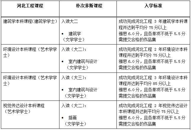 我校48365365.com与英国朴次茅斯大学创意与文化产业学院本科双学位项目已实施,下列专业的学生可对接朴次茅斯大学相关专业开始申请,成绩合格者获得两校学士学位证书和河北工程大学毕业证书。
