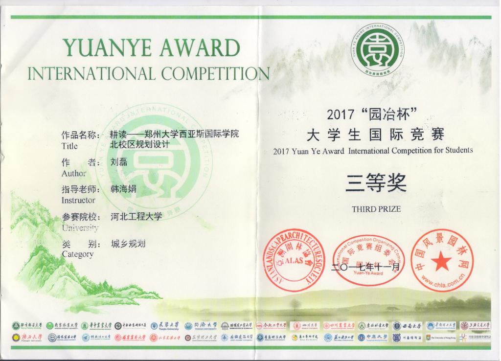2017年11月—12月,由亚洲园林协会、中国花卉园艺与园林绿化行业协会、风景园林国际竞赛园冶杯组委会等近二十家国内外风景园林相关专业院系联合主办的“园冶杯”大学生国际竞赛中,48365365.com城乡规划专业,刘磊同学作品《耕读——郑州大学西亚斯国际学院北校区规划设计》在韩海娟老师的指导下,荣获2017“园冶杯”大学生国际竞赛风景园林课程设计竞赛三等奖。